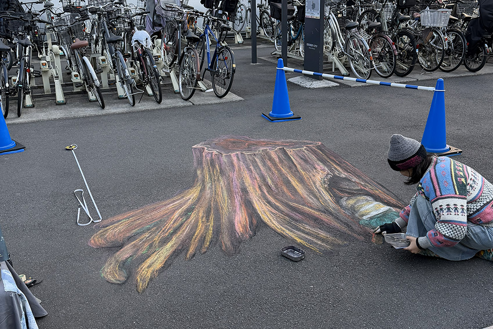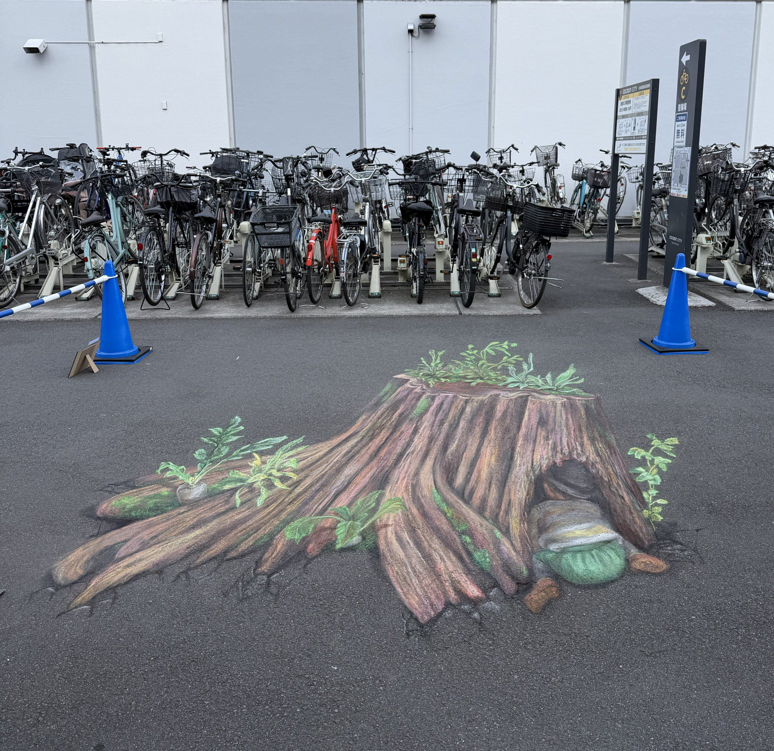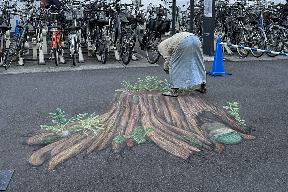 アスファルトから木が生えてきたような、立体的なアート!